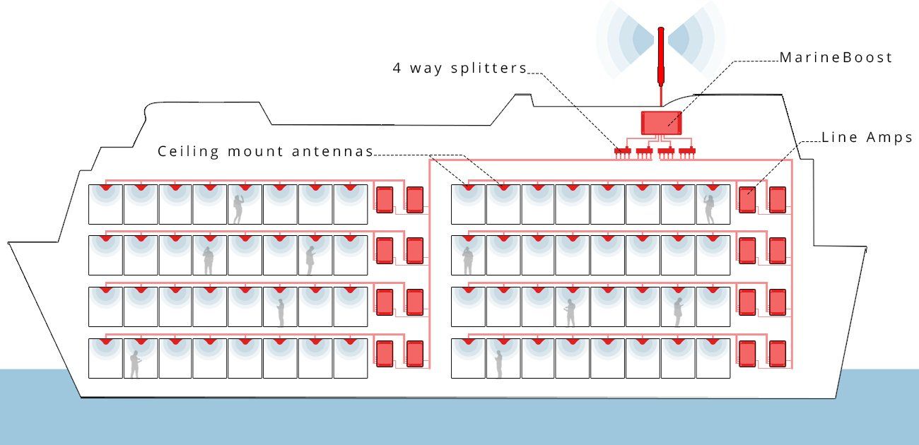 Se pueden añadir tantos amplificadores de línea como sean necesarios hasta conseguir la cobertura deseada. Hemos probado este sistema con 200 antenas para proveer de señal móvil a unas 600 camarotes de tamaño estándar.