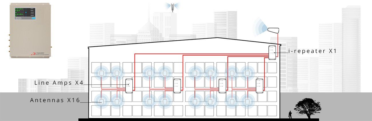 El i-repetidor es un repetidor de señal móvil de 5 bandas que puede monitorizarse y controlarse a través de Internet. Puede instalar el i-repetidor con 4 amplificadores de línea para llevar la señal móvil aún más lejos dentro del edificio, como ve en la imagen anterior.