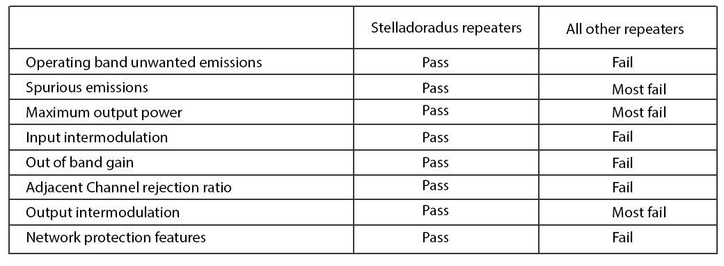 Solo los repetidores Stelladoradus superan estas pruebas y por lo tanto, son los únicos repetidores de banda ancha legales disponibles en Europa.