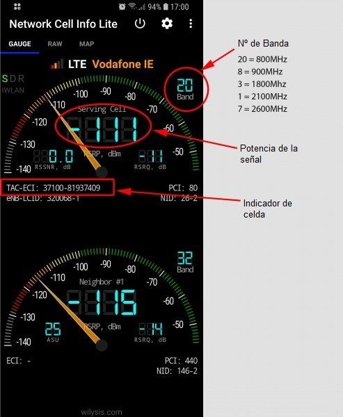 Network Cell Info Lite te indicara la potencia de la señal que recibe tu móvil en la banda en la que este configurado. Un nivel de -100dBm es una señal muy débil. -75dBm es una buena señal. En la escala puedes ver varios colores que indican en la calidad de la señal: verde la señal es buena, amarillo la señal es baja pero se pueden cursar llamada y navegar (dependiendo de la banda) naranja señal muy baja, rojo sin señal. Network Cell Info Lite también te mostrará el número de banda a la que esta conectado tu telefono, que es exactamente la Banda de frecuencias, mira la tabla de debajo.