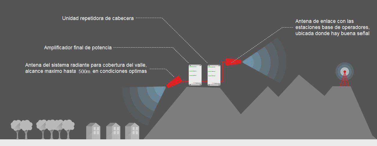 - Todo el sistema va instalado en lo alto de un monte, o en una zona elevada por encima de la zona exterior en la que se necesita cobertura. En este punto es necesario que haya un buen nivel de señal móvil.